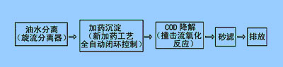 廢水的處理過程:前級采用旋流分離器對含油廢水進行預處理,它利用兩種不相溶液體的比重差,在壓差的條件下,產生高速旋轉,使得密度高的水拋出,密度小的油溢出,實現油水的高效分離,它相對于自然重力沉降平流隔油高效得多,離心分離后能有效地除去大部分的浮重油,降低次級負荷(降低加藥量),次級采用豎流沉淀池進行破乳、絮凝沉淀,在豎流沉淀加藥池的混凝方式是加藥方向與被處理的廢水相對流,保證充分、快速混凝。為配合發揮藥物的最佳功效,采用特殊的控制方式響應系統各種因素的變化,通過絮凝沉淀完成對石油及SS的有效處理,后級采用氧化-過濾器對COD進行有效降解。系統的COD主要由維修分廠的廢水產生,成分主要為芳烴族類,氧化—過濾器通過撞擊流的方式,利用氣水高速相撞,改變芳烴族類的理化特性,從而降解系統的COD。廢水經過以上工藝處理后環保考核的主要三項指標COD、SS、含油率達到了國家一級排放標準(COD≤100ppm. SS≤70ppm,含油率≤5ppm)。