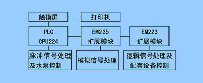 自控系統分為兩級:上位監視級和下位控制級,如圖2所示。監視級由一臺日本Hakko公司的V606i型觸摸屏和一臺打印機組成,實現現場工作狀態的同步監視,并可隨時打印現場的運行數據。控制級由一臺S7-200 CPU224 型可編程邏輯控制器(PLC)及一個模擬量采集模塊EM 235、一個I/O擴展模塊EM 223和觸摸屏組成。其中,PLC用于流量采集、1#、3#計量泵的輸出信號處理和反洗水泵、攪拌泵、空壓機、抽水泵的控制;EM 235用于PH計的信號輸入和2#計量泵的輸出信號處理;EM223用于水位信號采集和漩流分離器、撞擊流裝置的控制;觸摸屏除了提供監視功能,也具有控制功能,可通過它設定參數及實現對每個系統設備的單獨控制。觸摸屏和PLC之間通過RS-442/485轉換線通信。