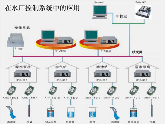 系統的網絡結構設計則采用RS-485工業總線和Ethernet(TCP/IP)組合形式,系統將現場的信號,包括水流量、水溫、雜質含量、水壓力等參數,通過相應的傳感器的數據采集,用研祥公司的基于RS-485總線的數據采集與控制模塊,將傳感器的數據進行采集,送入到泵房的控制工控機中,并運用相應的組態軟件進行數據處理,再送到操作員控制室,可以在中控室進行數據瀏覽和監控。同時,如果需要進行相應的控制,則是通過網絡向各個泵房的工控機發出相應的指令,運用各個模塊的控制功能,實現各個泵房的控制。于是實現各個泵房的無人值守,穩定可靠工作。