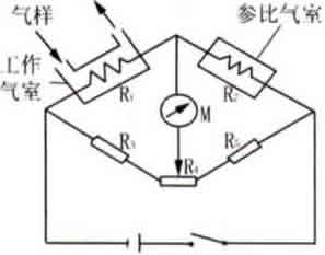 XP—311A型可燃性氣體檢測儀利用熱效應來實現檢測。儀表的檢測部分為一電橋,其中一臂上裝有檢測原件(金屬鉑絲)R1,另一臂上裝有參比元件R2。接通電源后,檢測原件加熱升至工作溫度。當可燃氣體進入工作氣室后,在檢測元件上發生氧化反應(進行無焰燃燒),釋放燃燒熱,使檢測元件進一步升溫,阻值增大,從而破壞了電橋平衡,檢流計M便指示出以爆炸下限濃度為刻度的氣樣相對濃度。
