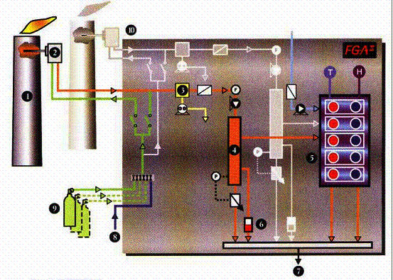 FGAII 是一種采用抽取采樣法的多種氣體分析系統。ChillerProbe(2)采樣探頭負責抽出樣氣并對其進行預處理,然后把干凈、干燥并經過冷卻的樣氣送入分析儀。分析儀首先對樣氣的壓力和流量進行精密調節,然后利用傳感器模塊(5) 進行濃度測量。系統同時供給傳感器模塊空氣,從而使其能夠在連續測量樣氣濃度的同時,周期性地完成零點和量程漂移檢查。