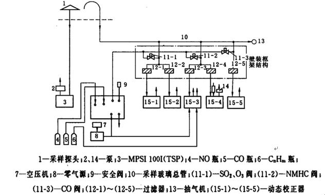 采樣系統分集中采樣和單獨采樣兩種方式。集中采樣系統指在每一子站設一總采氣管,由抽風機將大氣樣品吸入,各儀器的采樣管均從這一采樣管中分別采樣,但總懸浮顆粒物或可吸入顆粒物應單獨采樣。單獨采樣系統指各監測儀器分別用采樣泵采集大氣樣品。實際工作中常將這兩種方式結合使用。如圖: