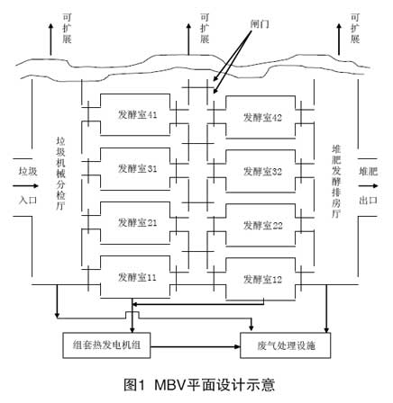 MBV環保設施由垃圾機械分檢廳、厭氧性發酵模塊、堆肥發酵排房廳、組套熱發電機組、廢氣處理設施5大部分組成,其平面設計示意見圖1。