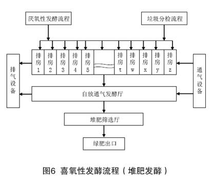 喜氧性發酵流程由發酵排房序列、自放通氣發酵廳、堆肥篩選廳、通氣設備和排氣設備5個部分組成。具體流程見圖6。