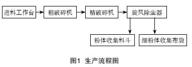該系統的主要設備為:進料工作臺、粗破碎機、精破碎機、旋風除塵器、粉體收集料斗、細粉體收集布袋、風機等。生產流程見圖1: