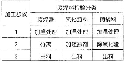 表1是含鉛固體廢焊料再生處理的工藝流程。按表所示,首先要對廢焊料進行檢驗分類,并對廢焊音、廢氧化渣和掏鍋料分別采用不同的工藝進行回收處理。