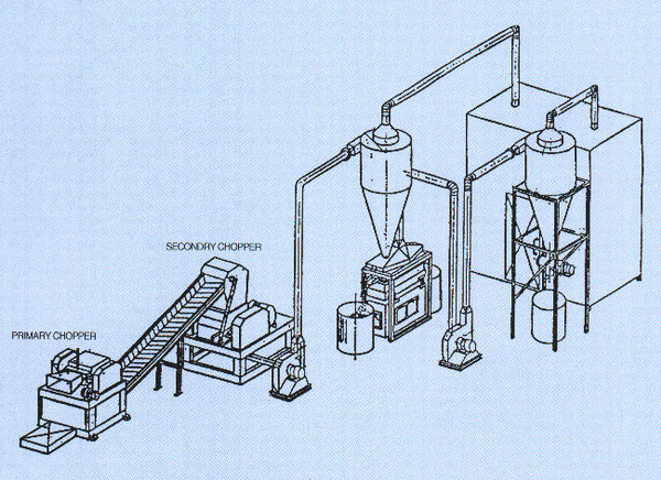 包括:1號切斷機、帶式輸送機、2號粉碎機、磁鐵輸送機、鼓風機、選別機、旋風器、旋轉閥門、布袋除塵器、調控器等。