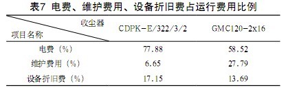 窯尾電收塵器與在線脈噴袋收塵器的一次性投資、運行費用比較見表6,電費、維護費用、設備折舊費占運行費用比例見表7。