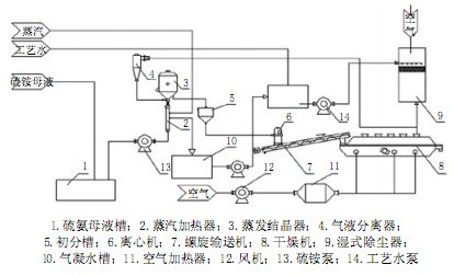 硫銨工段系統主要由硫銨溶液槽、過濾器、初分槽、硫銨循環泵、蒸發器、結晶器、硫銨加熱器、離心機、氣液分離、冷凝器、空氣加熱器、振動流化床干燥器、真空泵等組成。該系統的主要作用是完成脫硫后硫銨溶液的儲存、蒸發、結晶及包裝等。
