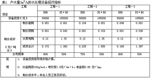 EDR的運行壓力<0.2MPa,以湛江市康寧路自用純凈水工程(工程-1),肇慶市端州八路商業純凈水工程(工程-2),廣東省地建集團粵西公司凈水工程(工程-3)為例,單獨使用EDR與選用軟化器DI+RO流程進行比較,經濟指標列表1如下: