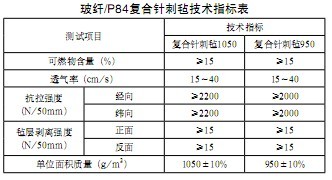 經過批量生產及性能跟蹤檢測,玻纖/P84復合針刺氈技術指標如下表。