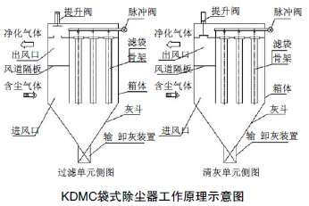 KDMC袋式除塵器由箱體、灰斗、濾袋、袋籠、提升閥、脈沖清灰系統、進出風管、卸灰裝置、清灰控制器等等組成。