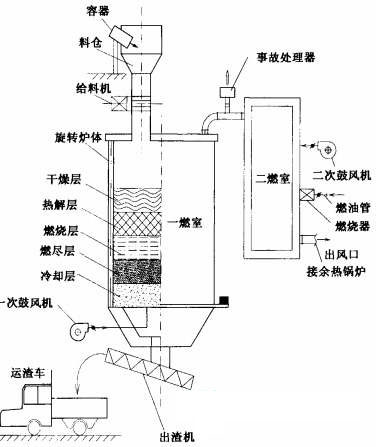 醫療廢物倒入爐體上部料倉后,由給料器均勻送入爐膛,通過爐體旋轉使醫療廢物均勻分布在干燥層上部,爐膛內自上而下依次為干燥層、熱分解氣化層、燃燒層、燃燼層和冷卻層。運行時,從爐體底部送入一定量的空氣(只滿足燃燒層所需氧量),先經過冷卻層冷卻燃燼的爐渣,同時加熱空氣,再通過燃燼層和燃燒層,供給其空氣量使醫療廢物燃燒至1100-1300℃,所產生的熱量由煙氣帶入熱分解氣化層,在1100-600℃溫度下使醫療廢物熱分解氣化生成以H2、CO、 CH4等低分子碳氫化合物為主的可燃性氣體,與煙氣混合并進入干燥層,高溫氣體使剛加入爐膛內的醫療廢物千燥,溫度達600~300℃的混合氣體再進入二燃室,停留時間≮2s,在二次空氣及輔助燃料(實際運行時很少使用)作用下,≮1100℃的燃燒溫度使混合氣體充分燃燼,產生的高溫氣體進入余熱鍋爐進行熱交換。