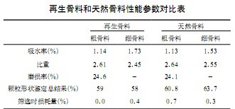 再生骨料是指將建筑垃圾進行物理或化學處理,使其成為符合有關規定和質量標準的混凝土骨料。再生骨料具有與天然石子接近的物理和力學性能,是一種比較理想的配制低、強度中等的再生混凝土材料,可廣泛用于道路工程、市政工程和房屋建筑工程。研究表明,僅采用再生粗骨料制成的再生混凝土,其性能與普通混凝土相差無幾。同時國內有關的試驗數據也表明,應用再生骨料的混凝土具有拌和物流動性低, 粘聚性、保水性好等特點,并且在同配合比的條件下, 應用再生骨料的混凝土立方體抗壓強度還有一定的增加。此外,韓國一家再生骨料生產公司所生產的再生骨料和天然骨料的性能參數對比數據,也表明用再生骨料代替天然骨料配制混凝土是可行的(見下表)。