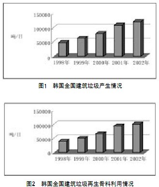 以韓國為例,韓國建筑垃圾產生量1 9 9 8年為47693噸/日,2002年為120141噸/日。建筑垃圾再生骨料占建筑垃圾的百分比1998年為76.6%,2002年為83.4%,循環利用的年平均增加率為26.1%(見圖1和圖2)。可見韓國建筑垃圾的產生及再生利用量正在逐年增加,再生利用率也在逐年提高。