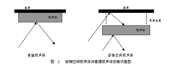 巖棉空間吸聲體的特點是中高頻吸聲系很高的一般均在0.8左右,而低頻聲系數較低,一般在0.2左右。因此我們把提高巖棉空間吸聲體低頻吸聲性能作為一個重點進行反復試驗。最終試驗發現,吊高在室內凈高1/7至1/5時吸聲體的中低頻吸聲性能比較好,符合寬頻帶吸聲體的設計要求。