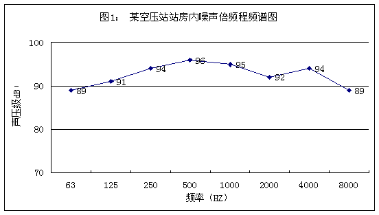 表1:某廠空壓站站房內的實測噪聲數據和實測頻譜圖![]() |