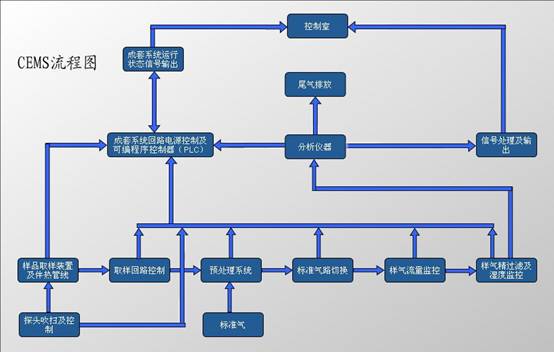 預處理單元:包括壓縮機除濕器、耐腐抽氣泵、氣溶膠過濾器、反吹單元等。用于完成樣氣的凈化、除塵、除濕。標準氣從預處理前端通入,經過預處理系統,這樣使樣氣和標準氣以同樣條件進入分析儀器,減少系統誤差。氣體取樣設備在機柜內,樣氣首先經過制冷室除濕,然后進入第二個有固定露點的冷凝器,穿過氣溶膠過濾器分離硫酸,通過濕度報警精細過濾器并檢測冷凝器的故障,產生的輔助信號進入分析儀故障信號切斷抽氣泵。故障排除后泵自啟動。氣體分析儀能夠同時有選擇地測量多種組分的氣體。系統可連續工作,正常情況下無須維護。分析單元:多組份紅外分析儀測量NOx、CO、CO2、SO2和O2,分析儀提供自動標定功能,由于它極其穩定可靠、重復性、開發了新的數學模型,該儀器具有一點校準功能。用零氣對儀器進行校準,可省去標準氣。各參數通道相互獨立,穩定可靠。智能化程度高,和樣氣接觸的紅外氣室可拆卸清洗,極大地降低了維護成本。控制單元:PLC是CEMS系統的數據采集、控制單元。與常規的控制方式不同,PLC提供了更為豐富的功能和更高的可靠性、擴展能力。在CEMS系統中,PLC提供了各種模擬量數字量的輸入輸出信號,并通過軟件進行深度處理,其功能主要包括: