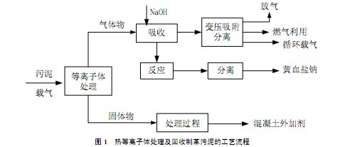 從 2003 年起,筆者在國家自然科學基金資助項目“熱等離子體處理制革污泥及其資源化研究”和教育部科學技術研究重點項目“皮革固體廢棄物資源化新技術”的資助下,進行制革污泥處理及資源化方向的研究工作。該項目以熱等離子體化學和技術為基礎,研究制革污泥的高效、節能、 減量、 無害化處理的物理化學過程及其機理, 及處理后的氣態和固態產物回收利用的可行性。具體說, 以氮氣為介質氣體; 基于在此反應相中, 制革污泥中的大分子有機物被徹底分解為 H2O、 CO2、N2、HCN 及小分子的烴類物質等氣體成分。其中,HCN 經過處理可用于制備黃血鹽鈉這種高級染料的原料;甲烷等小分子烴類可回收用作燃料;而 Cr 3+ 、Ca + 、Na + 及少量的其它金屬以氯化物或硫酸鹽的形式呈玻璃態固體,可用作建筑材料的防水劑和早強劑。在此基礎上,結合實驗研究,建立熱等離子體處理制革污泥的工藝可控體系及反應過程的物理模型;為最終實現制革污泥的“資源化”和“零排放”提供科學依據和應用基礎。 筆者正在研究實施的工藝流程圖如下: