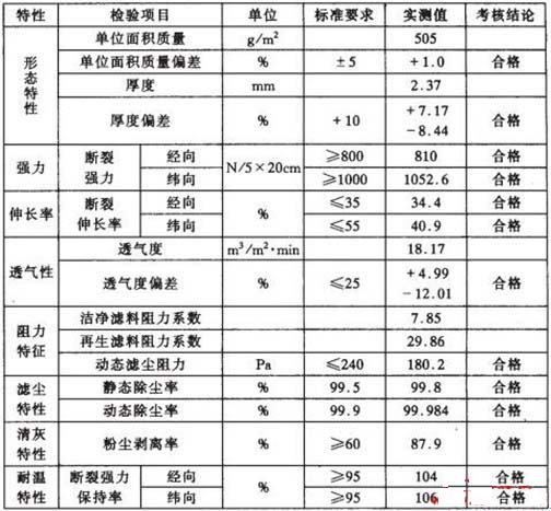 2002年10月東北大學濾料檢驗中心對某公司引進的PPS短纖維研制的PPS針刺濾料進行了常規物理機械性能測試,結果如表1所示。