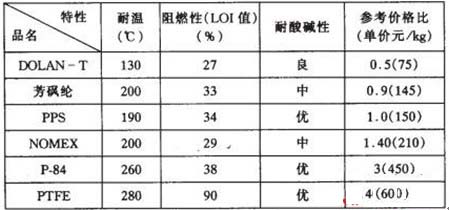 PPS、DOLAN-T、芳砜綸、NOMEX、P-84和PTFE的耐溫性能、阻燃性、耐酸堿性及價格作比較,結果見表4。