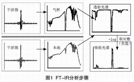 完成一個傅立葉變換的分析,需要三種光譜資料,即氣樣光譜(Sample Spectrum)、背景光譜(Background Spectrum)和參考光譜(Reference Spectrum)。氣樣光譜表示的是調制的紅外線被煙氣中各種組分吸收后的光譜;背景光譜則是調制的紅外線經過純N2的吸收光譜,有時也稱零點光譜(Zero Spectrum);而參考光譜是一種標準光譜,它貯存在計算機數據庫中,作為定性和定量的依據。FT-IR的步驟如圖1所示。