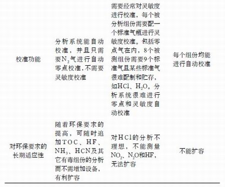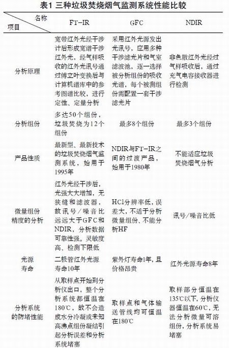 我國的垃圾焚燒煙氣監測工作大致走過了十年的路程,先后采用過非色散紅外煙氣分析系統(簡稱NDIR)、氣體過濾相關分析系統(簡稱GFC)及FT-IR系統。表1給出了這三種分析系統的性能比較。
