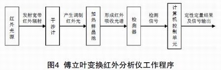 傅立葉變換紅外分析儀由寬帶紅外光源、干涉計、加熱樣品池、檢測器和計算機控制單元五個部分組成,其工作程序如圖4。