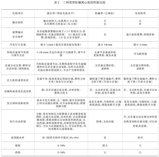 機械型和雙電機型是通過帶輪變速或雙電機驅動,形成轉鼓、螺旋各自的獨立的絕對轉速,差轉速是這二個絕對轉速的差值(即它們之間的相對轉速);液壓型的差速器實際是固定于轉鼓并隨之同步旋轉的液壓馬達,當液壓泵站通過特殊的高壓旋轉分配器向液壓馬達供油時,螺旋才會在液壓差速器的驅動下,產生疊加在轉鼓轉速(螺旋的牽連轉動)上的相對轉動,從而形成轉鼓、螺旋之間的差轉速。