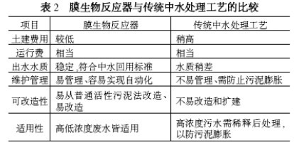 (1) 膜生物反應器用膜生物裝置將傳統污水處理的曝氣池與二沉池合二為一,不僅節省了用地面積,且能高效地進行固液分離,其分離效果好于傳統的沉淀池,出水懸浮物和濁度接近于零,出水水質良好,達到回用水質在技術上是可行的,實現了污水資源化。