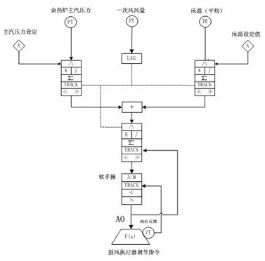 一次風量指令在進行處理時,需要考慮燃料的特性及負荷變化情況,燃料不同時,助燃空氣量會有所不同。負荷不同一次風量占總風量的比例也會發生變化,同時,如果床溫偏高,增加一次風量;如果床溫偏低,則減小一次風量。當床溫偏高,增加了一次風量,則總風量相應增加,總風量調節回路輸出減小,則一次風、二次風指令減小,最后達到平衡時,一次風增加,二次風減小,從而達到調節床溫的目的。下圖為鼓風機變頻調節的控制方案,其它MCS方案不再贅述。