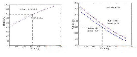 為使袋式機組更好地應用于卸料機粉塵控制,首先針對PL機組進行了性能測試及分析。對PL-2200機組進行發塵實驗,平均發塵濃度:2.01g/m3,測得機組入口風量及標志風量與機組濾袋阻力隨發塵量變化關系如圖1、圖2所示。