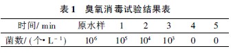 為此, 在實驗室又對單位時間內不同的臭氧投加量進行試驗, 當臭氧投加量為7. 0 ~ 8. 0 g/ m3時, 消毒已達到效果。具體結果見表2。