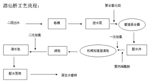 酒仙橋污水深度處理廠采用“老三段”(混凝、沉淀和消毒)處理工藝。污水處理廠二級出水首先經過鏈板回轉式格柵機截留雜物,然后由泵提升至機械加速澄清池,在該池入口處投加聚凝劑(聚合氯化鋁)、絮凝劑(聚丙烯酰胺)并加氯進行一次消毒,機械加速沉清池出水經過快速濾池過濾進一步截留水中細小雜質后進入清水池,在清水池入口處加氯進行二次消毒,最后由輸水泵提升到中水管網向用戶供水。