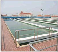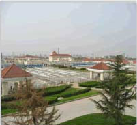根據冬季低溫低濁,夏秋短期高濁度水的原水水質,水處理采用預加氯氧化、串級機械混合、豎流波形板絮凝、平流式加側向流波形斜板沉淀池、改進型氣水反沖洗“V”型濾池、液氯消毒的工藝流程。技術先進,流程合理,占地小,效率高,出水水質好。串級機械混合可隨水量的變化調節混合強度,保證混合效果最佳;豎流波形板絮凝池占地小,對水量變化不敏感,絮凝效果好;在國內首次采用了平流加波形斜板沉淀池,對原水水質變化既具有較高的緩沖能力,又有處理低溫低濁水效果好的特點,沉淀時間較常規平流沉淀池縮短了三分之一。采用改進型氣水反沖洗“V”型濾池,截污能力強,反沖洗效果好,出水水質優于其它濾池,節水、節電效果明顯。水廠設有生產廢水處理系統,在國內大型水廠中率先實現了生產廢水“零”排放。可節約水資源和增加供水收入,并且保證水廠的生產廢水不會對周圍環境產生二次污染。 水廠建成兩年來,系統運行穩定,出廠水濁度保持在0.5度以下,達到了國際水平,處理工藝達到了設計預期。