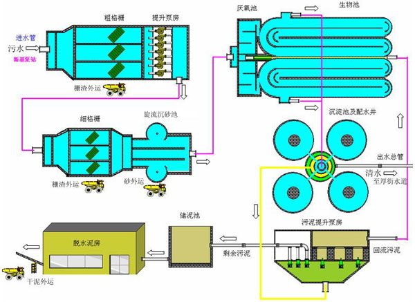 一期工程污水處理采用厭氧-氧化溝工藝,主要流程如下: