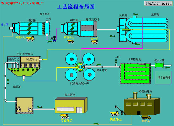 該廠概算總投資6億元,其中廠區投資2億元,管網投資4億元。廠區、管網全部由東莞市財政投資興建,分兩期建成,其中一期于2001年9月動工,2002年6月投入試運行,采用厭氧—氧化溝工藝(A/O工藝),處理能力為10萬噸/日;二期于2003年9月動工,2004年8月28日投入試運行,采用缺氧、厭氧—氧化溝工藝(A2/O工藝),處理能力為10萬噸/日。截污主干管總長度為14.77Km,管徑為D1400mm至D2600mm;支干管總長度為4.9Km,管徑為D300mm至D1600mm。