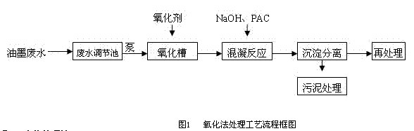 采用氧化法處理PCB油墨廢水,是一種強烈氧化反應。氧化法常用的處理方法有:燃燒法、電解氧化、化學氧化、光氧化。燃燒法是將高濃度有機廢水燃燒處理的方法,對處理燃燒值較高的有機廢水是一種好方法,但處理費用高,不能普遍采用。電解氧化法處理成本高、設備投資大,降解程度有限。光氧化還處于研究階段。化學氧化法采用氧化劑有NaClO、H2O2、O3,可將大部分有機物降低到一定濃度,但不徹底,費用也很高,其工藝流程如下:
