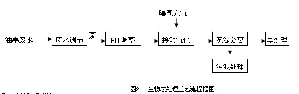 采用生物法處理PCB油墨廢水,一般采用接觸氧化法,但進入生化槽的廢水的CODcr必須小于1000mg/L,一般要對PCB油墨廢水進行預處理或稀釋,經生物處理后出水CODcr可小于200mg/L。但生化處理需曝氣充氧,動力消耗大,處理費用也很高,而且該種廢水的可生化性較差。PCB油墨廢水中常含有一定量的重金屬離子,對生物具有毒害作用,大大降低了生物的活性。另外,其廢水pH值要嚴格控制于中性條件。PCB油墨廢水本身的一些固有特性(BOD與COD之比值太低,生化性太差),嚴重影響了生物法的應用。生物法處理工藝如下: