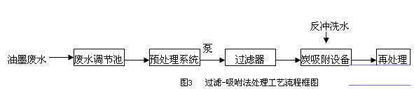 過濾-吸附法處理PCB油墨廢水,先將廢水預處理后由泵打入過濾器,廢水經過濾器處理后可去除大部分的油墨及懸浮物,過濾出水進入活性炭吸附設備,通過活性炭的吸咐、分解作用,能達到很好的處理效果。但采用此工藝處理PCB油墨廢水,活性炭很易飽和,處理率較低,運行成本較高,另外,由于廢水中的油墨粘性較大,容易粘在管路、設備上,設備故障率高,此工藝不便采用。過濾-吸附法工藝如下: