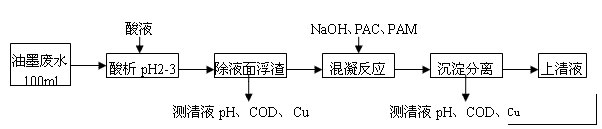 A、 分別取每個廠家的油墨廢水(在油墨廢水收集槽直接取混合液,混合液由不同的生產線排出的各種油墨廢水混合而成)各100ml于燒杯中,測其原水pH值、CODcr和Cu;