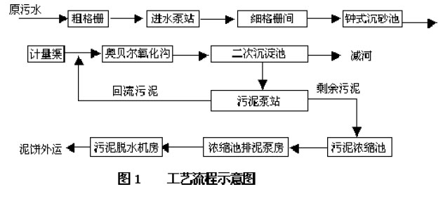 設計采用了奧貝爾(Orbal)氧化溝工藝,作為大型城市污水處理廠,在國內尚屬首例,其工藝流程如圖1。