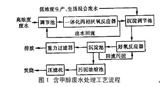 ①高濃度含甲醇廢水通過精餾塔進行預處理,回收97%以上的甲醇,這既有一定的經濟效益,又把高濃廢水的COD值控制在合理的范圍內,為后續處理減輕壓力。精餾后廢水水質指標見表1。