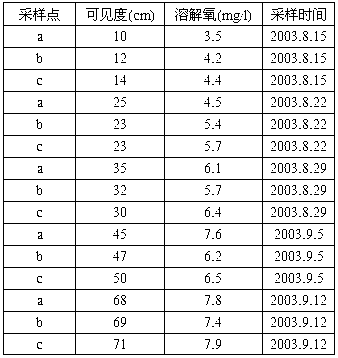 按上面小池面積200m2,底泥平均厚度0.3m,8月15日于小池第一次投加VB997一桶13.5公斤,投加前取池底含水底泥,加VB997混合均勻,曝氣放置兩天,均勻噴灑于水面。8月30日第二次投加13.5公斤,方法同前。整個過程,每周檢測水體可見度、溶解氧,數據如下: