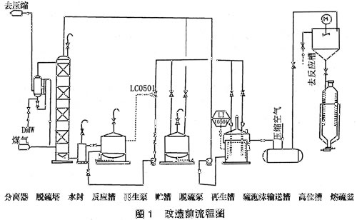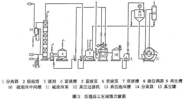在原流程上增加了硫泡沫中間槽、硫泡沫泵、真空轉鼓過濾機及過濾所需的真空罐、濾液罐。硫泡沫從再生槽溢流至硫泡沫中間槽,連續或間斷有硫泡沫泵打入高位泡沫槽,加熱分層,清液返回系統,底部硫膏由真空過濾機進行過濾,形成的濾餅裝袋處理。