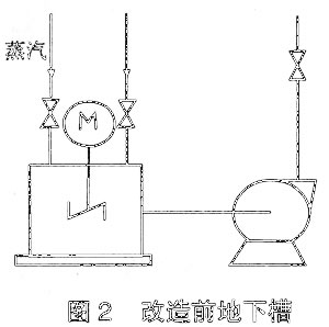 將原地下槽內設置了2塊隔板,使利用部分的體積約為原來的1/2,并將原地下槽內的攪拌器和堿液泵去掉,該增一液下泵,在蒸汽管線和液下泵出口回路管線末端各加一45°彎頭。如圖4所示。