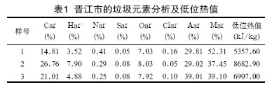 垃圾中的可燃成分越多,越容易燃燒。經對晉江市垃圾的采樣分析得知,垃圾低位熱值為5357.6~8682.9kJ/kg,垃圾的含水率為37.45%~52.31%,垃圾容重350kg/m3。晉江市的垃圾元素分析見表1。