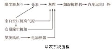 (2)布袋除塵器收集下來的飛灰,采用氣力輸送方式輸送到儲倉,儲倉有效容積為300m3,可存放約5~6d的灰量。除灰系統流程見下圖。