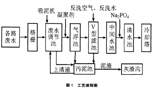 各路廢水通過格柵匯集到調節池中,在調節池頂設吸泥機,廢水在調節池內初步沉淀后,由廢水提升泵送人氣浮池。在氣浮池進水管投加凝聚劑,廢水中膠體和微小懸浮物通過混凝反應生成小顆粒礬花,被細微氣泡攜帶浮上水面,由刮渣機刮除,而清水則由氣浮池下部集水管匯集自流進人V型濾池。V型濾池濾后水進人中間水池,通過中間水泵送人清水池,在中間水泵出口投加Na3PO4調整清水pH值。最終產品水由清水泵送至工業循環冷卻水池。