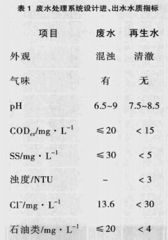 (2)防止產生生物污泥,使系統中銅管發生堵塞或產生污泥下的腐蝕,主要應控制COD、懸浮物和細菌的數量。由表1可見,廢水中的cl-已達到回用要求,可不必考慮。經現場調研得知,電廠定期在工業循環水中投加殺菌劑,則再生水中細菌數量也不必考慮。因此,本工程主要處理對象是廢水的pH、COD和懸浮物。經過詳細論證、分析,確定工藝流程如圖1所示。